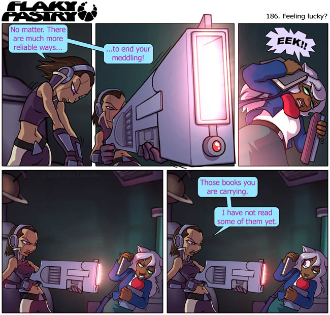 Also! This week I've finally updated my side comic, Outrageous Teen Assassin Aiko, after almost a year of not doing so. And I've decided, I should probably link to it in Stuff, even though I link to each new page in my art blog, Jogging, as I post them (This is also Stuff that is linked). Before you read OTAA, you may want to read OCAA, Outrageous Child Assassin Aiko, the 24-hour comic of which OTAA is the sequel. There are even one or two more things of interest there - things that are not strictly Flaky Pastry related, but done by me nonetheless!
