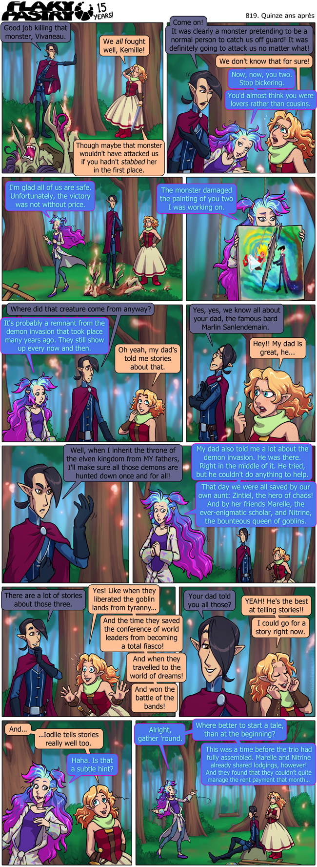 So, happy fifteenth Flakyversary, dear readers! Thank you so much for listening to my silly stories throughout the years! Have a slightly-larger-than-usual special comic to celebrate! This might look like a bookend, but not to worry! I still have more stories to tell. See you next week! <3
