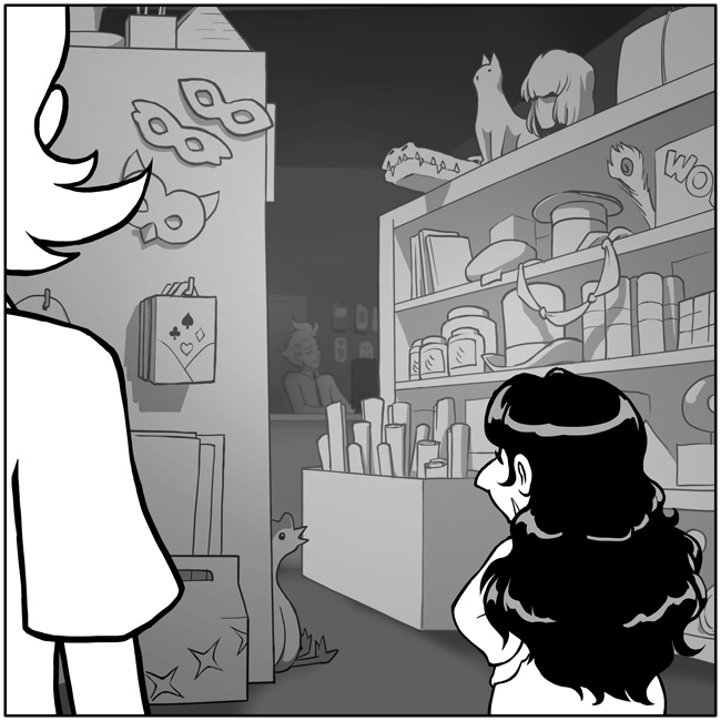 Morgana quickly slips in between an assortment of different-sized metal rings and a shelf full of stuffed animals. Expertly navigating the maze of widgets and doohickeys, she guides Mona and you toward the check-out counter, unintuitively situated at the back of all this.