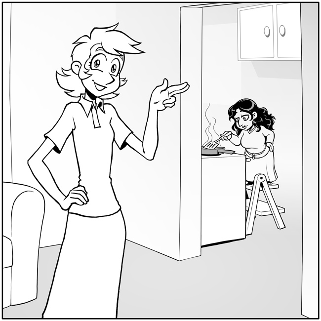 You nod and continue into the kitchen, where your other roommate, Morgana, is on her stepladder next to the stove, frying bacon and potatoes. The stepladder is necessary because Morgana is three and a half feet tall – a perfectly normal height for a halfling. Just like it's perfectly normal for her to have a four-course breakfast every morning.