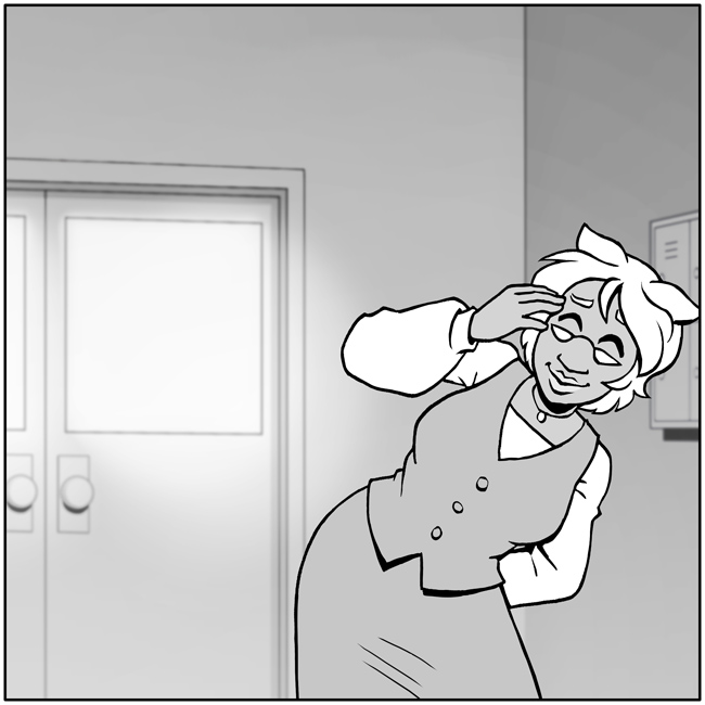 "Oh, and…" he continues, letting go of your shoulder. "This area is for employees only. So… if you could… y'know." He gestures with his head, indicating the way back out of this storeroom.