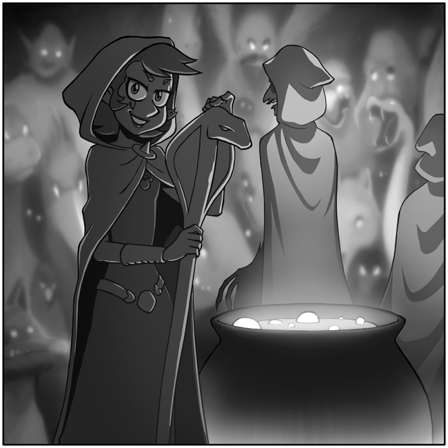 You carefully inch backwards, hoping none of the witches or their many familiar spirits will notice. Little by little, you make it to the outside edge of the circle. So far, so good. Alright, no one's looking at you… you make a dash for the woods outside this clearing.