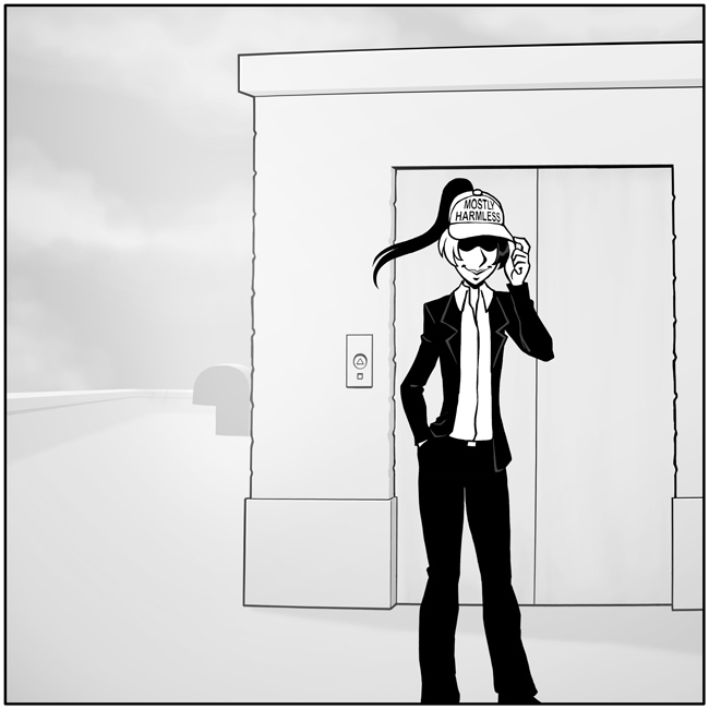 Apparently, she was not expecting to find you, crouching beside the door like a creep. Startled, she swings the maybe-weapon in your direction. As a wave of energy washes over you, vaporizing you into a fine mist, the last thing you hear is Zintiel chiding you: "Sheesh, you shouldn't sneak up on people like that!