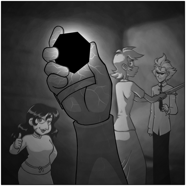 While Mona's interest in the Black Heptagon is mainly to keep its potentially sinister powers out of the wrong hands, Morgana speculates on its mystic significance – who created it, how long ago, and why; she imagines there's probably a bone-chilling story there. You figure both aspects are important; insofar as your hands are definitely the right hands to keep the gem safe and discover its secrets.